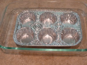 1. Place 12 ramekins in a large baking dish. No ramekins? No problem. You can use small glass pyrex bowls, coffee cups, or a disposable aluminum tin like the one pictured below.