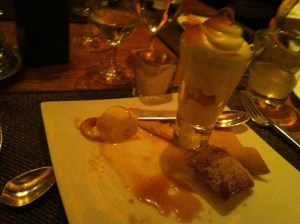 My main course was scallops with shredded shortribs, mashed sweet potato with foie gras, trumpet mushrooms, and fennel confit. The scallops were perfectly cooked – medium-rare – and the sweetness of the scallops complimented the earthy flavors of the shortribs and mushrooms. The mashed sweet potatoes with foie gras were rich and decedent. In short, a great plate.