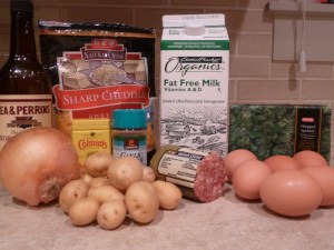 There’s a recipe below, but this is definitely a dish that is open to changes. Don’t like breakfast sausage? Use ham, bacon or omit the meat entirely. No potatoes on hand? No worries. Skip ’em.