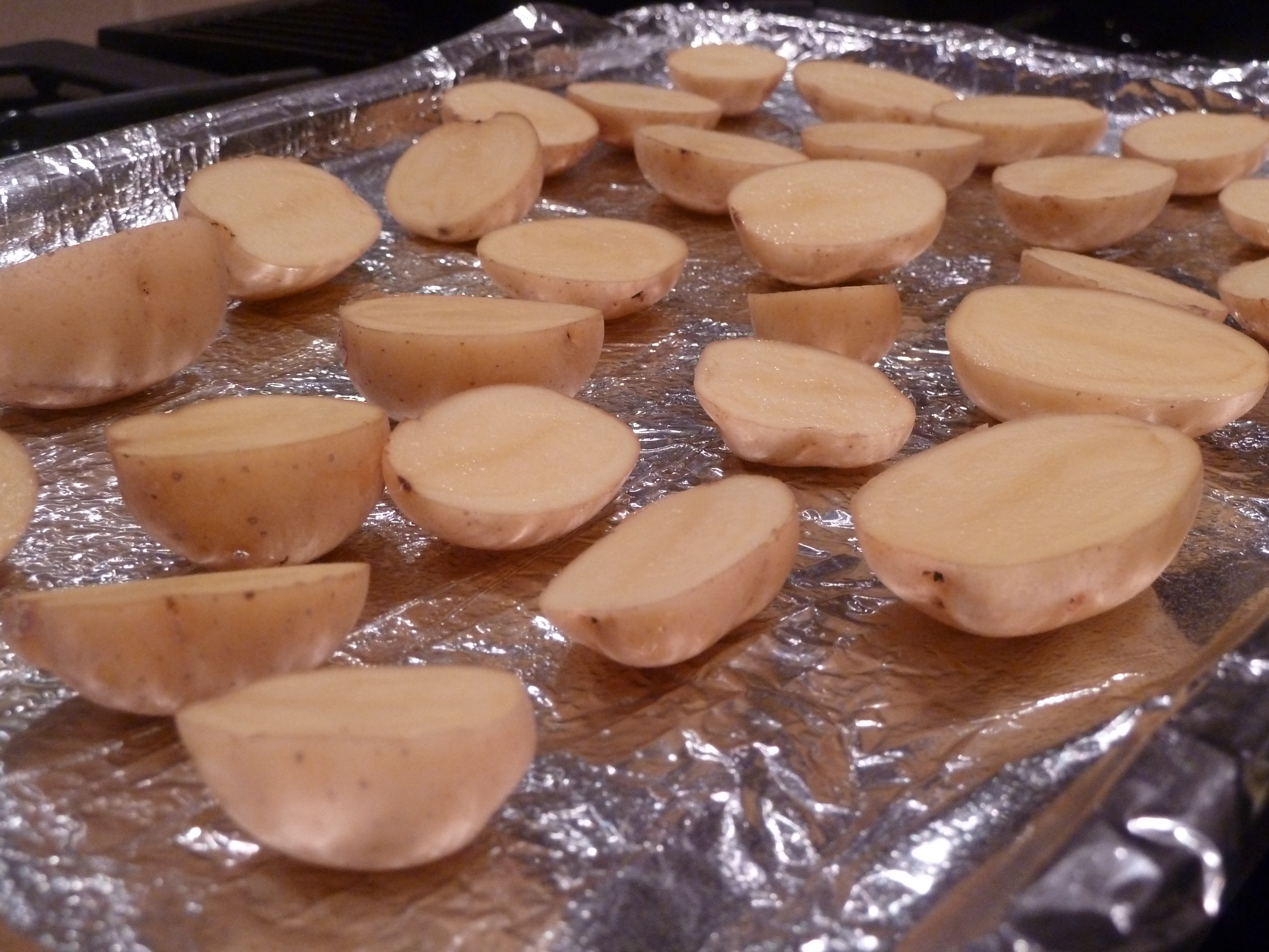 I started by slicing the potatoes in half and throwing them on a cookie sheet. I baked these at 400 degrees F for about 25-30 min.
