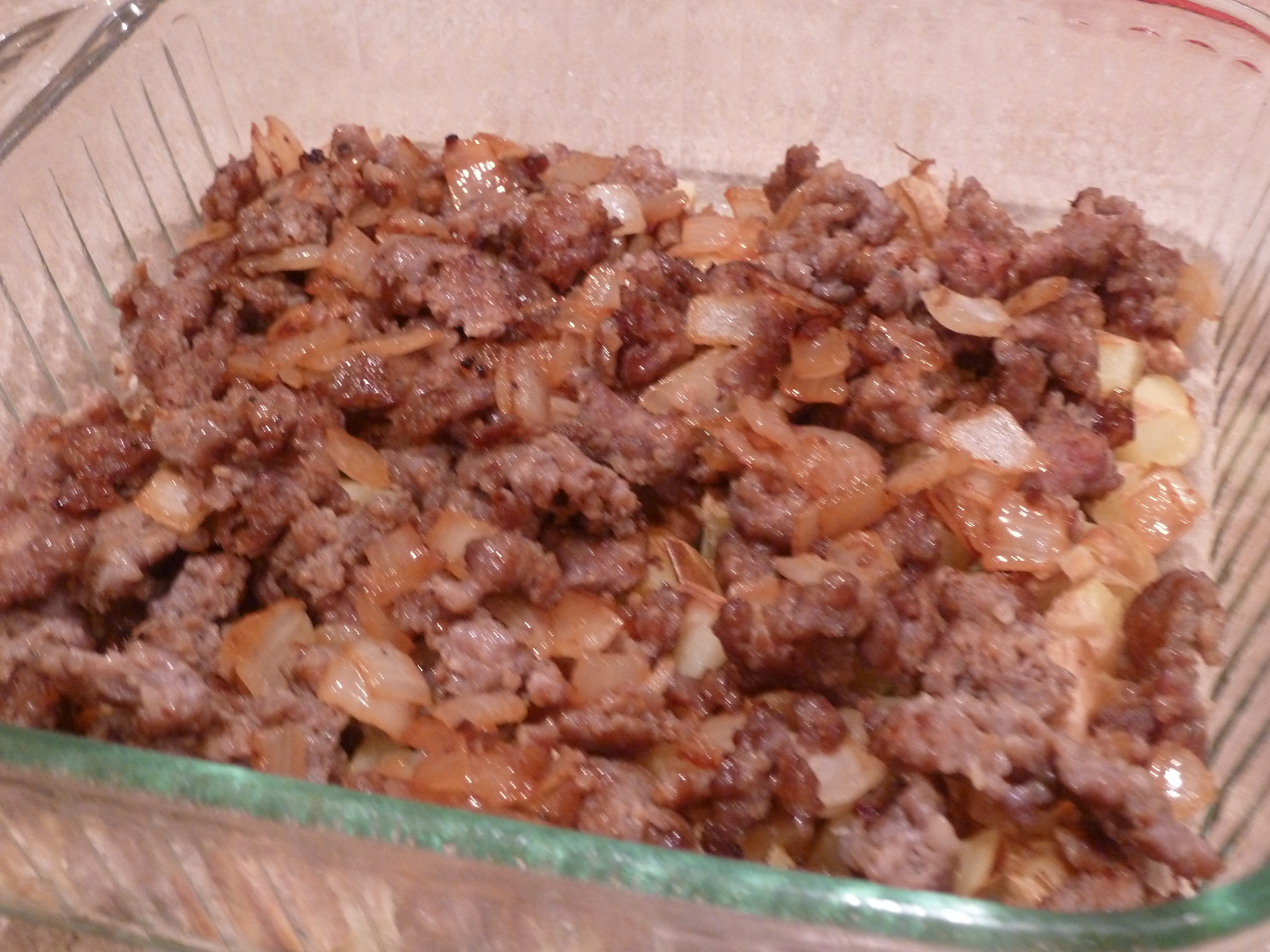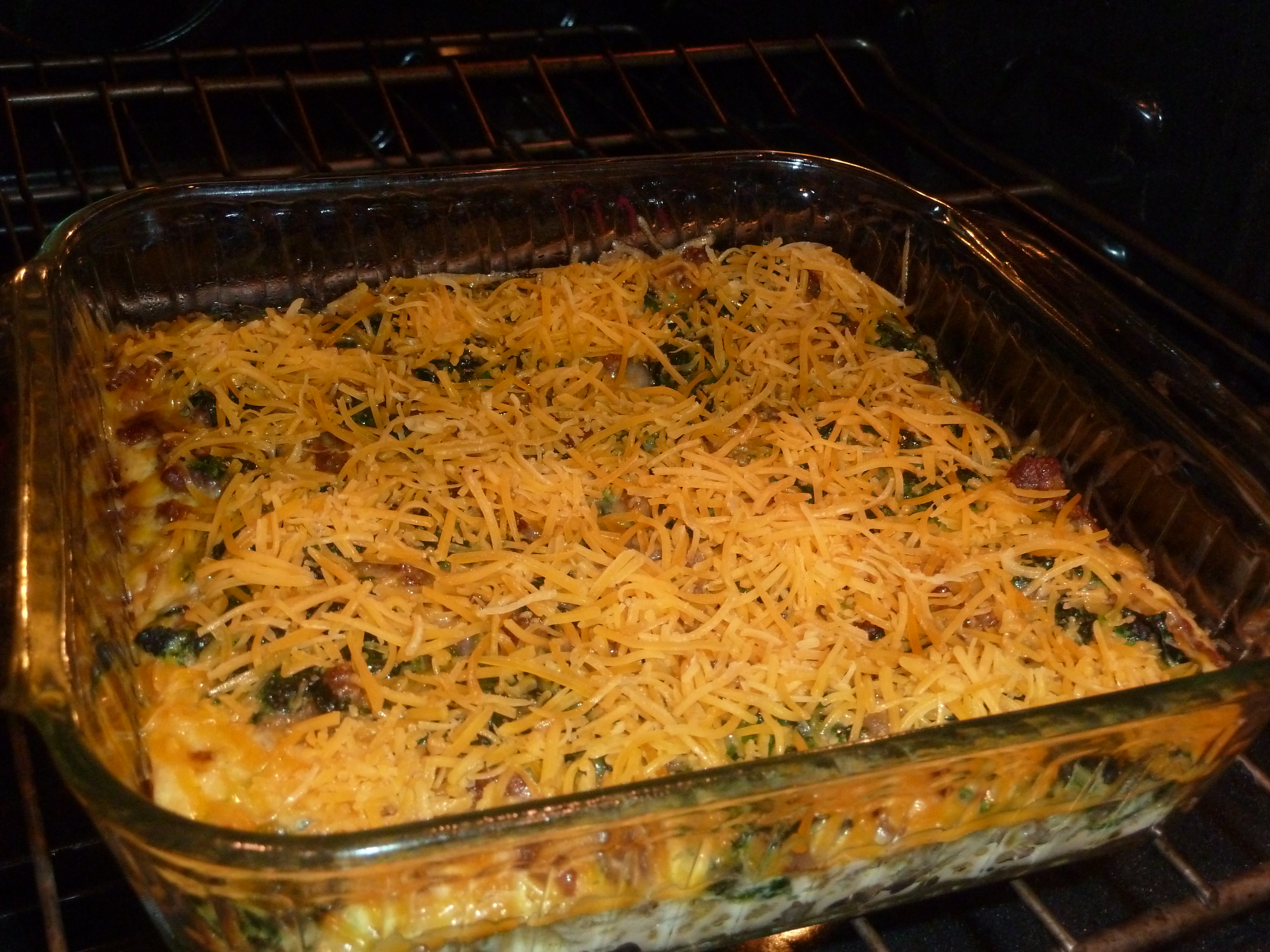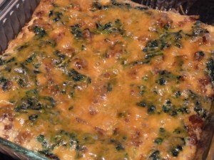 In the bottom of a greased 8″x8″ baking dish, layer the potatoes, sausage and onions, then spinach. Pour the egg mixture over the other ingredients.