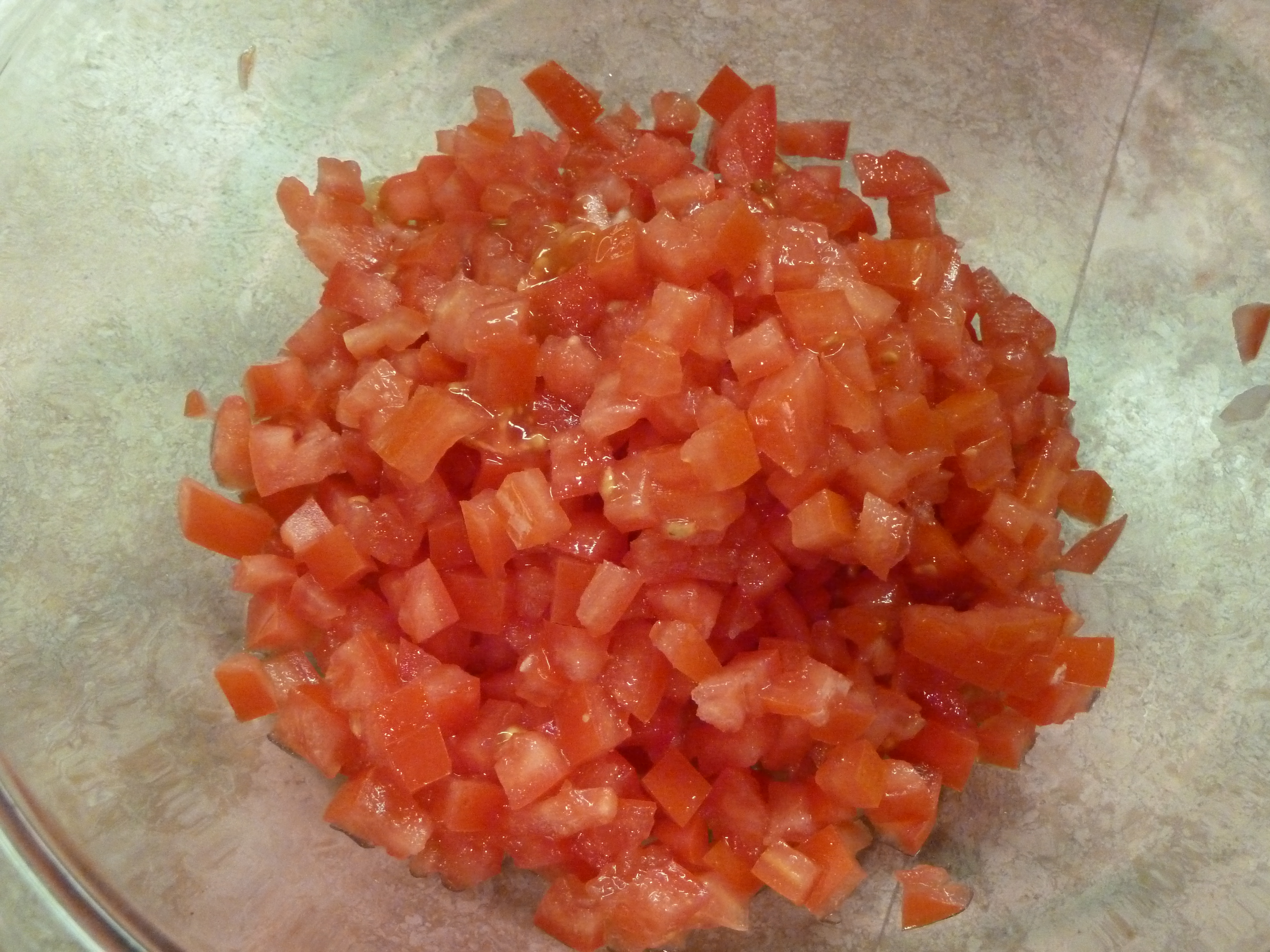 Start by chopping the tomatoes and adding them to a medium-sized bowl.