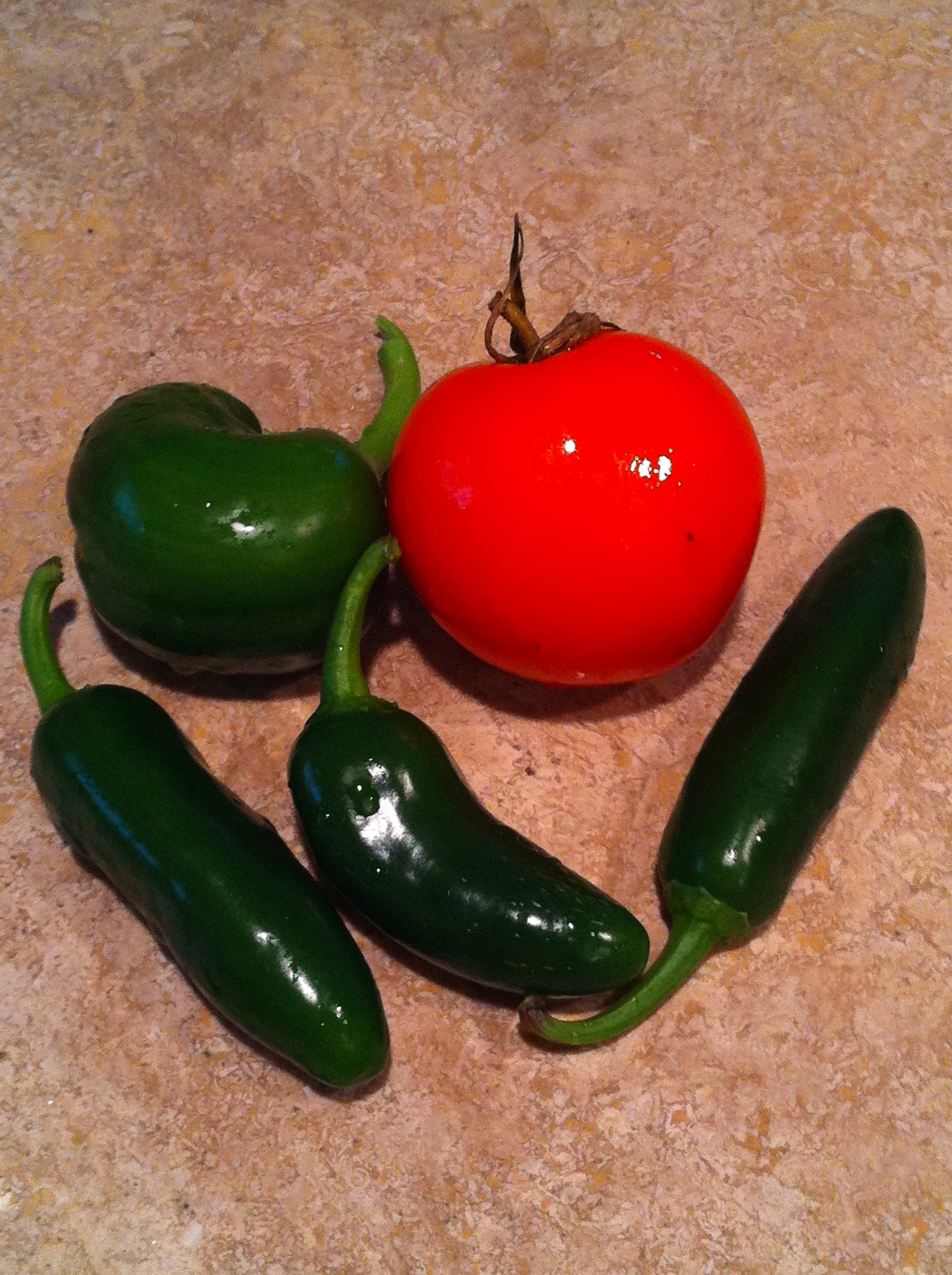I was inspired to make fresh salsa after I found these jalapenos, tomato and bell pepper in my garden this week.