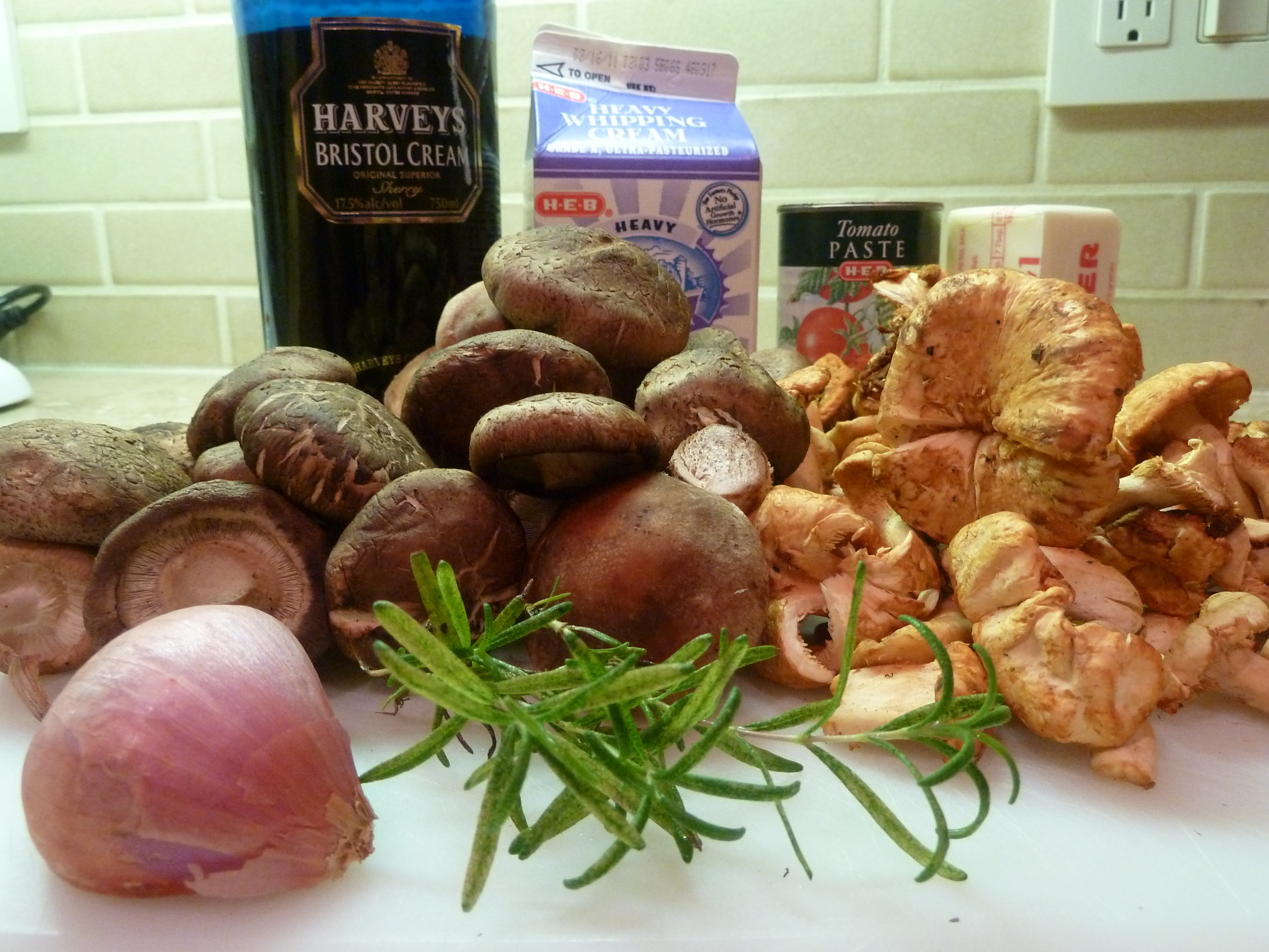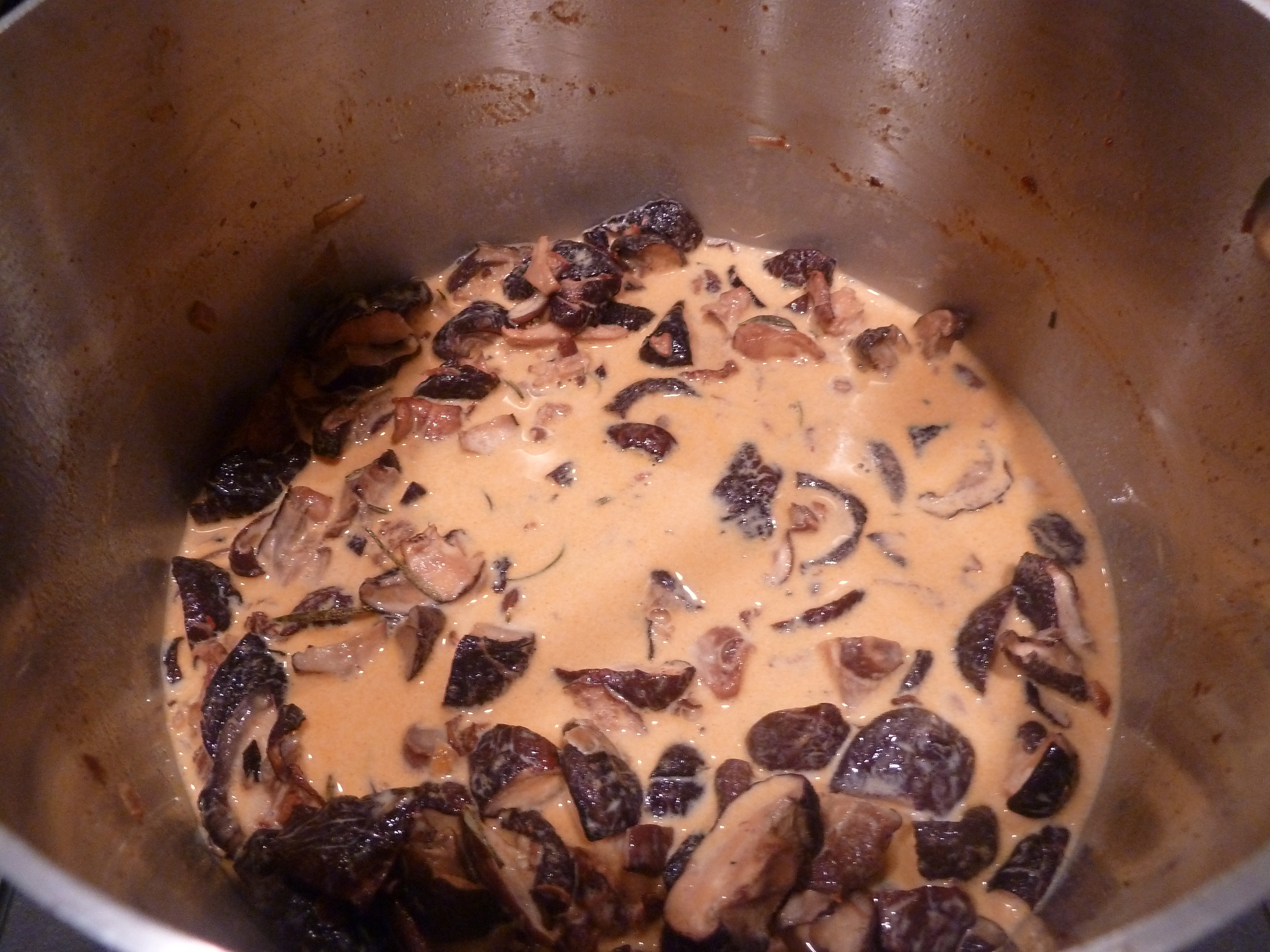 Stir in the sherry and cook for another three minutes. Add the roasted mushrooms, reserve mushroom broth, and cream. Cover the pan and simmer for 30 minutes.