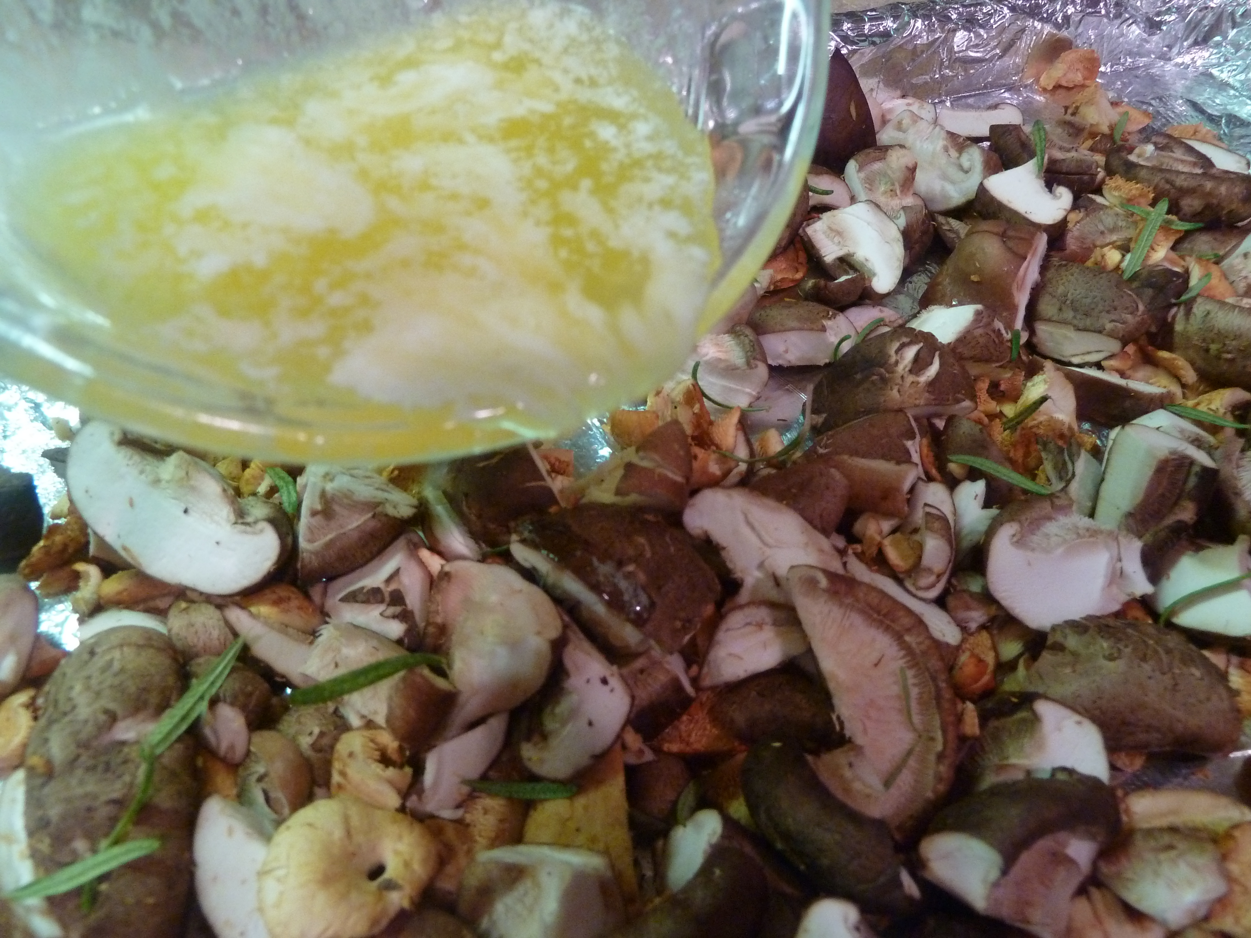 Chop the mushroom caps into small pieces, and lay them on a rimmed baking sheet with the rosemary sprig. Drizzle the butter and 1 tsp salt over them and roast in the oven for 20 minutes.