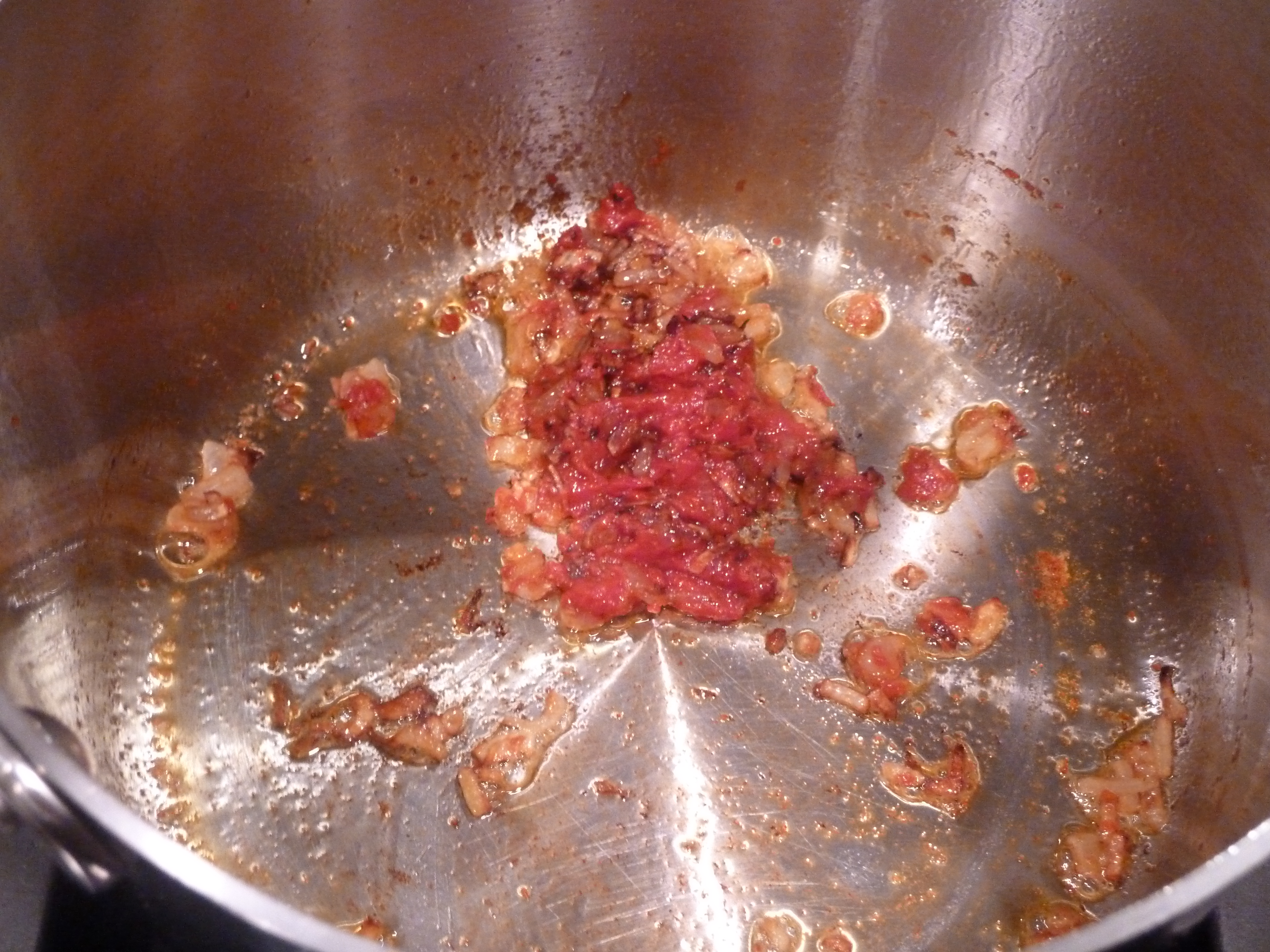 In a large saucepan, heat the oil over medium-low heat and add the shallots. Cook for about 10 minutes, stirring occasionally, until the shallots are translucent. Add the tomato paste and continue to cook for another 4 to 5 minutes, until the color becomes brick red.