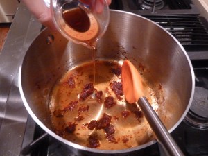 Cook for 4 to 5 minutes until it becomes brick red, then add the sherry and cook for another 2-3 minutes.