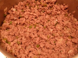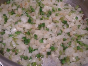 Start by dicing the onions, green bell pepper, garlic and celery. Saute the vegetables in olive oil until they start to brown.