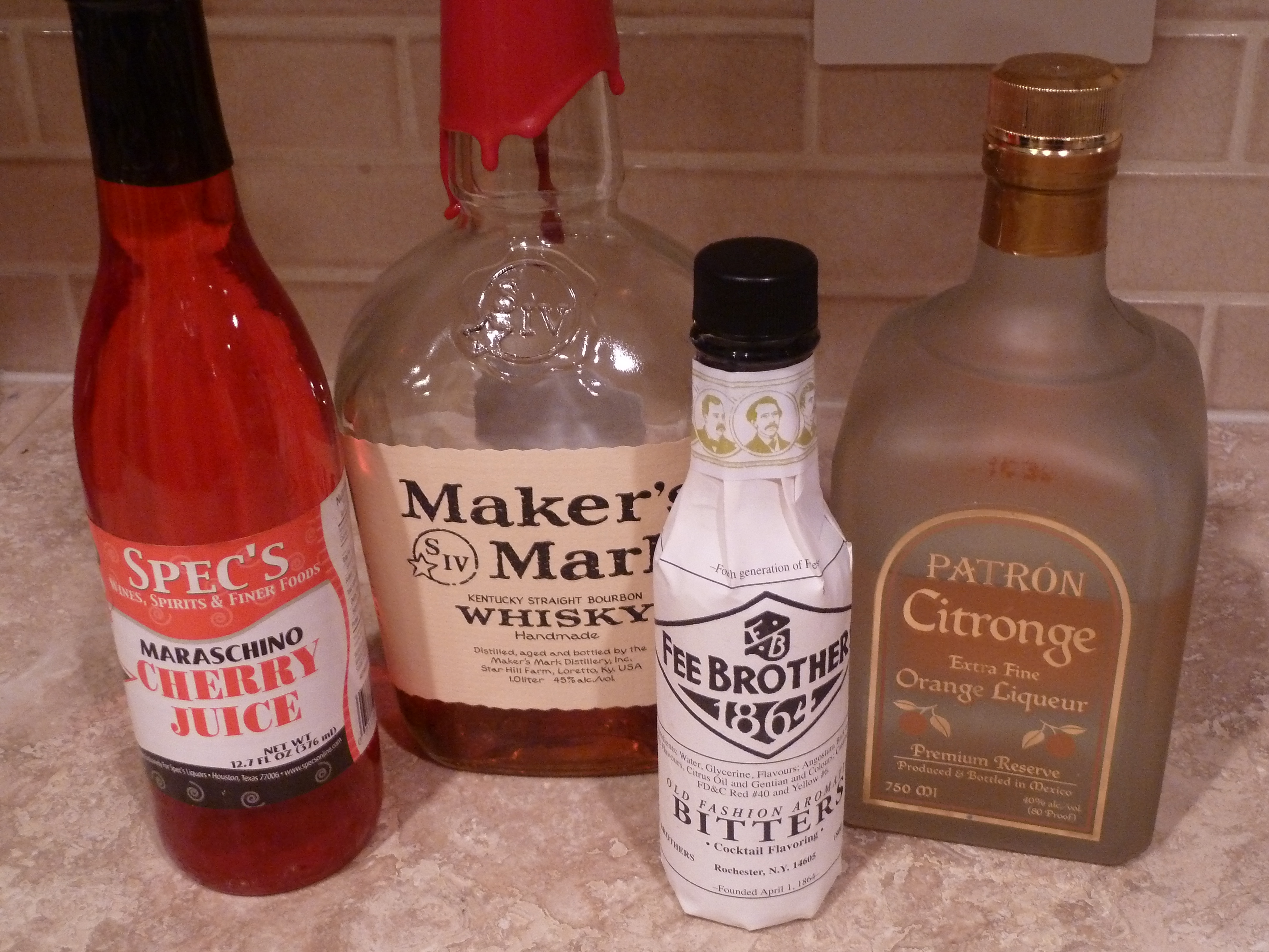 In a shaker, mix 1/4 c of Maker’s Mark bourbon, 2 tbsp of Patron Citronge, 5 shakes of bitters, and 1/2 tsp Maraschino cherry juice.
