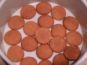 In a deep dish, place a layer of wafers. Stand a layer of wafers on edge around the side of the dish. On the first layer of waters place a layer of sliced bananas, then a layer of waters and another of sliced bananas and so on until you have the desired quantity.