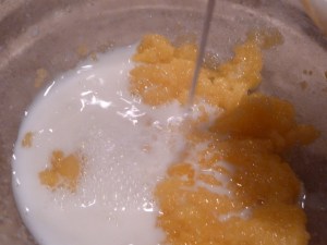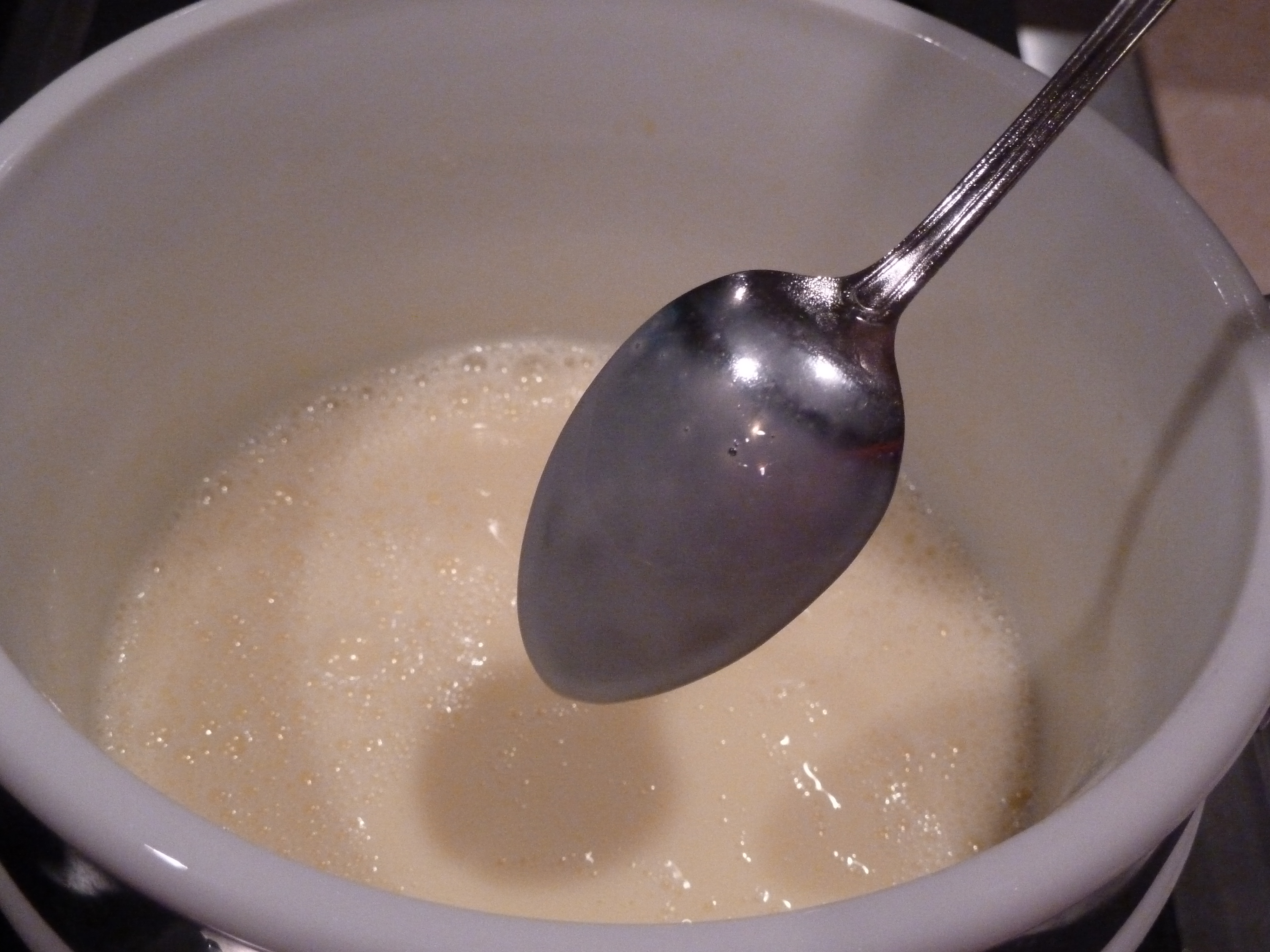 Scald the milk and add it to the beaten egg mixture. Whisk in the milk quickly so the eggs don’t cook.