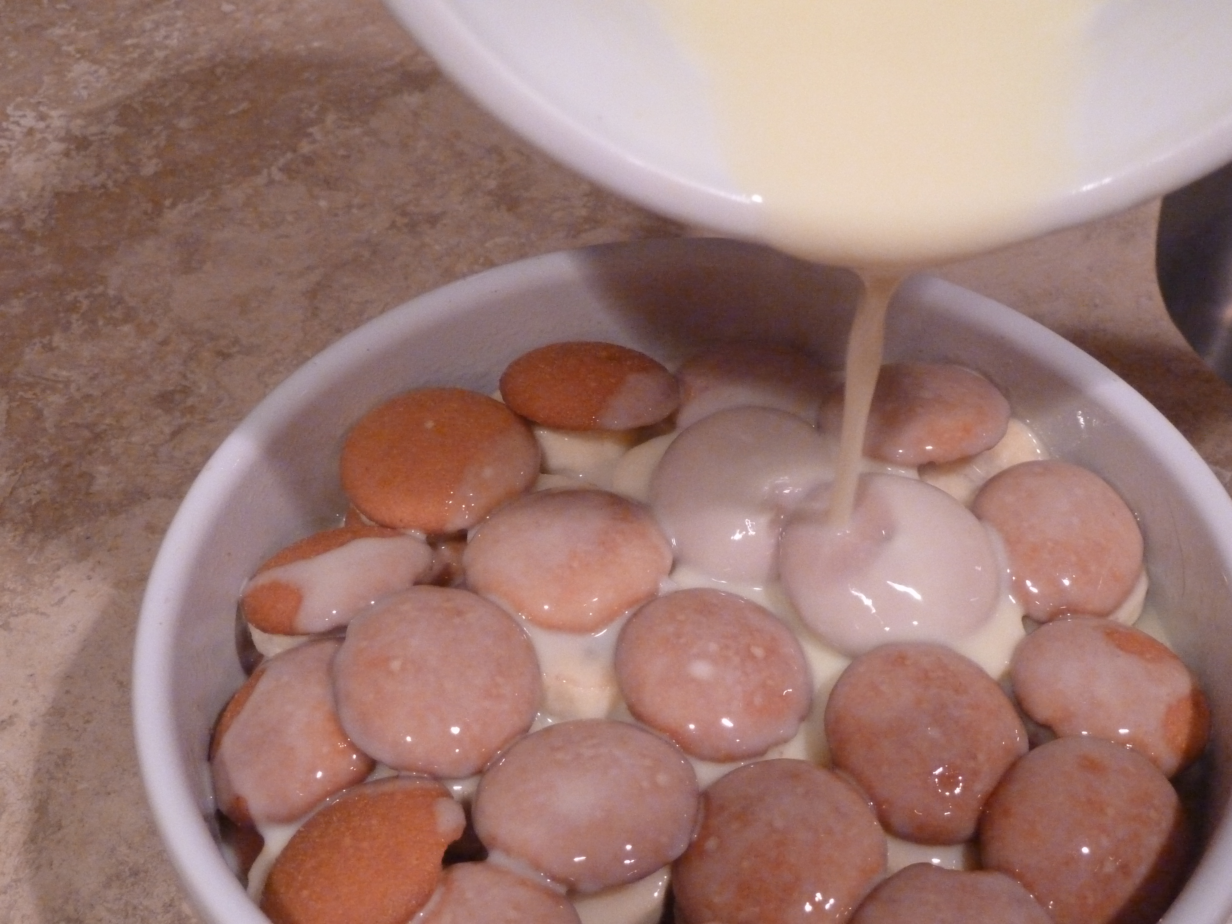 Pour the custard, which is as rich as liquid gold now, over the sliced bananas and vanilla wafers.