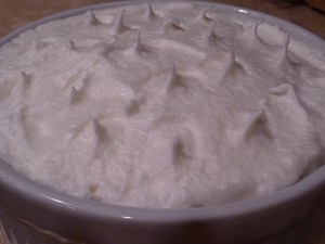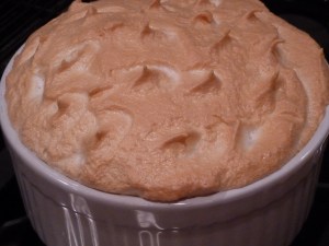 Beat egg whites with the 4 tbls sugar until stiff. Spread this over the contents of the dish and bake in a slow oven (275-300º) for 15-20 minutes or until beginning to brown.
