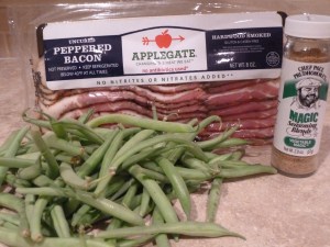 Cut the bacon into small pieces and cook in a saute pan for 3-4 minutes. After the bacon browns, but before it becomes crispy, add the green beans and seasonings. Turn the heat up. Using a pair of tongs, toss the green beans and cook for a minute or two more. Serve immediately.