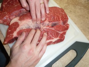 Separate the chuck roast into two pieces along the main line of fat.  This will allow you to remove the big piece of gristle in the middle of the roast.  This piece of gristle never really renders like the fat, so its best to remove it before cooking.