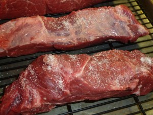 Once you’ve separated the roast, lay the pieces on a cookie cooling rack set in a jelly roll pan.  Salt the meat liberally on both sides and let it rest for an hour.