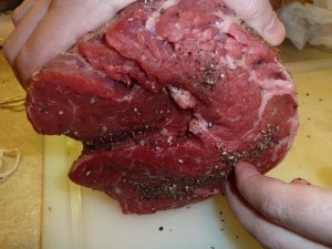 After an hour, sprinkle pepper on the meat.  Then roll the meat into a spiral.  This will make it into the shape of a roast again so it will cook evenly.