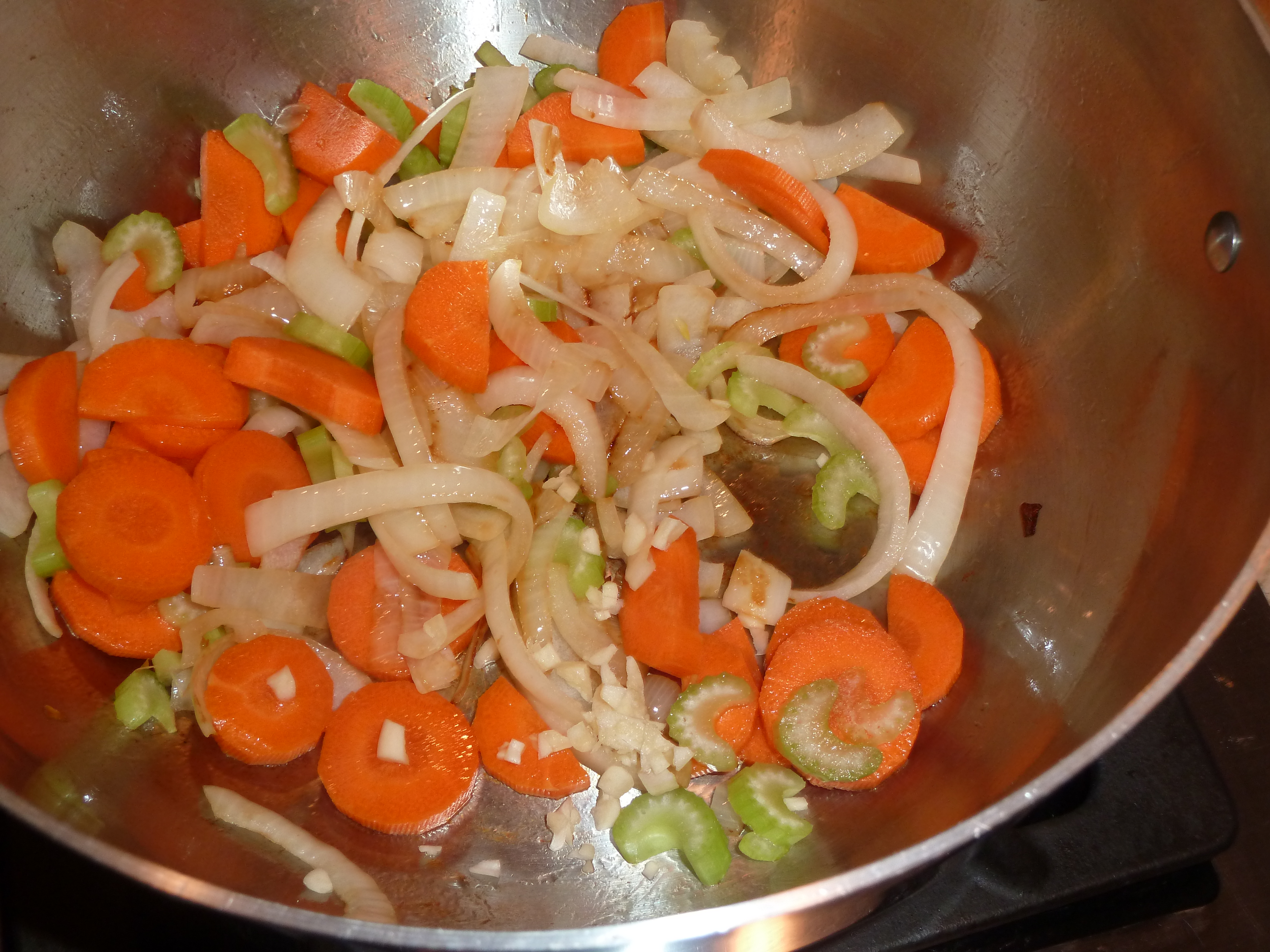 Once the onions have browned, add the celery and carrots.  Saute for 5 minutes until they have softened, then add the garlic.