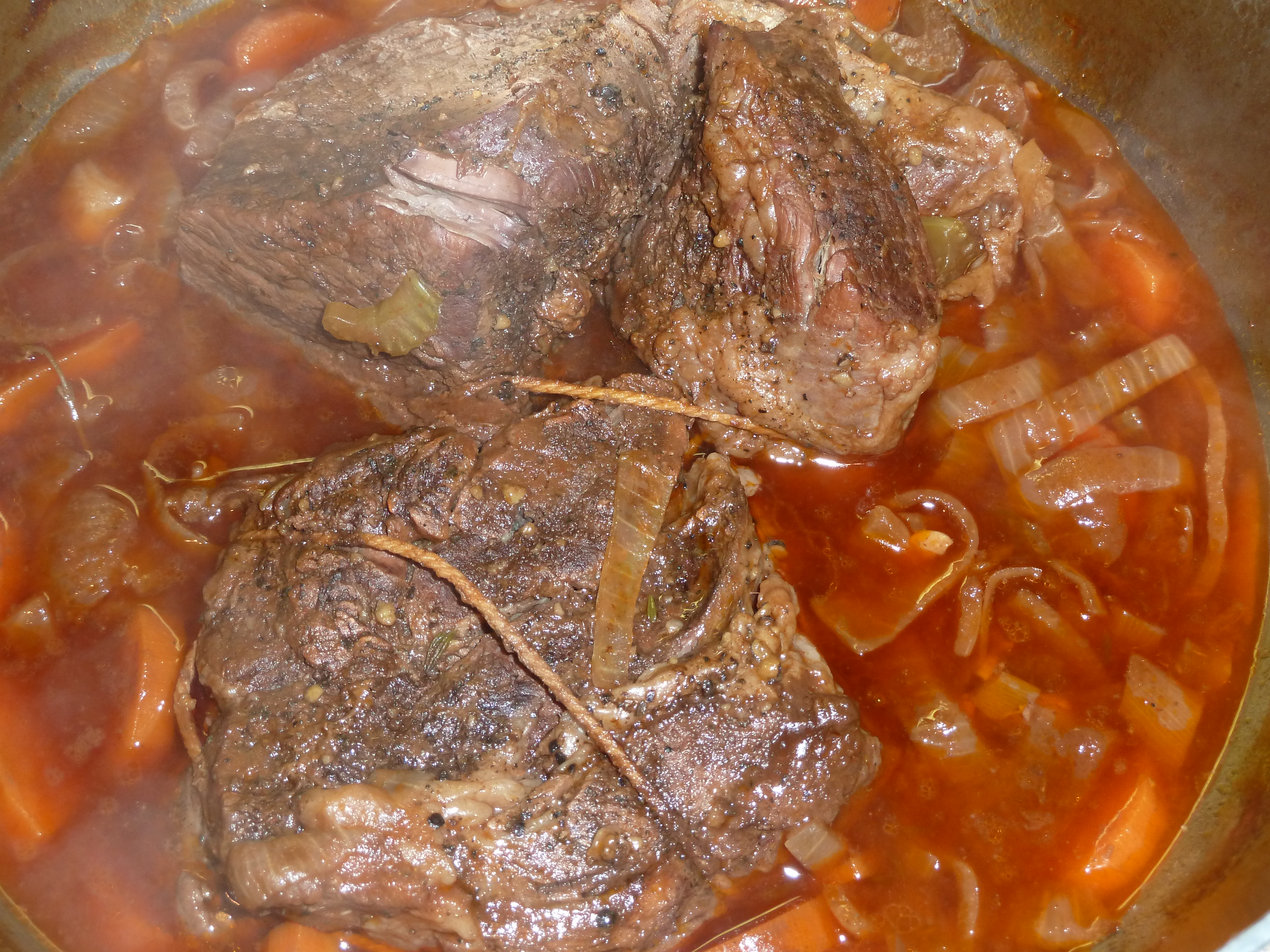 This is my “go to” pot roast recipe. Great flavor and everyone loves it. I like a nice California Cab with it, but then that’s what I am used to. If I feel like splurging I make garlic mashed potatoes, but any starch is good. This is real comfort food!