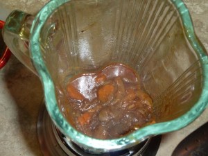 Add 2 cups of beef broth to the blender and blend until the mixture is smooth.  Pour the gravy into a pot and add the balsamic vinegar, wine and chopped thyme.  Stir until combined.