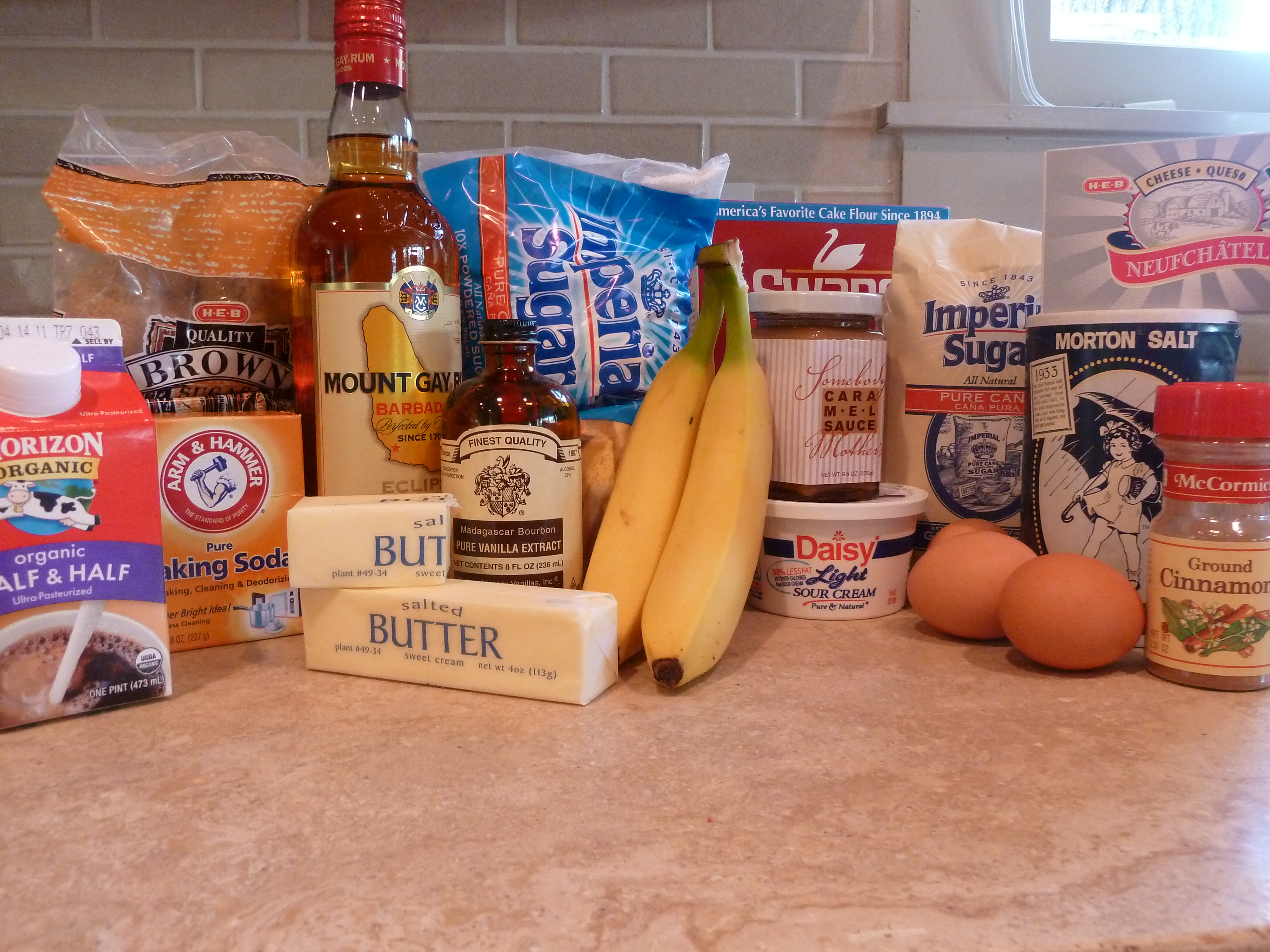 In your stand mixer, cream the butter until it is light-colored and fluffy. Beat in the sugar until combined. Add eggs, vanilla, rum, sour cream and the larger portion of the banana mixture. Mix well. In another bowl, sift together the flour, baking soda, and salt then add to the mixing bowl.