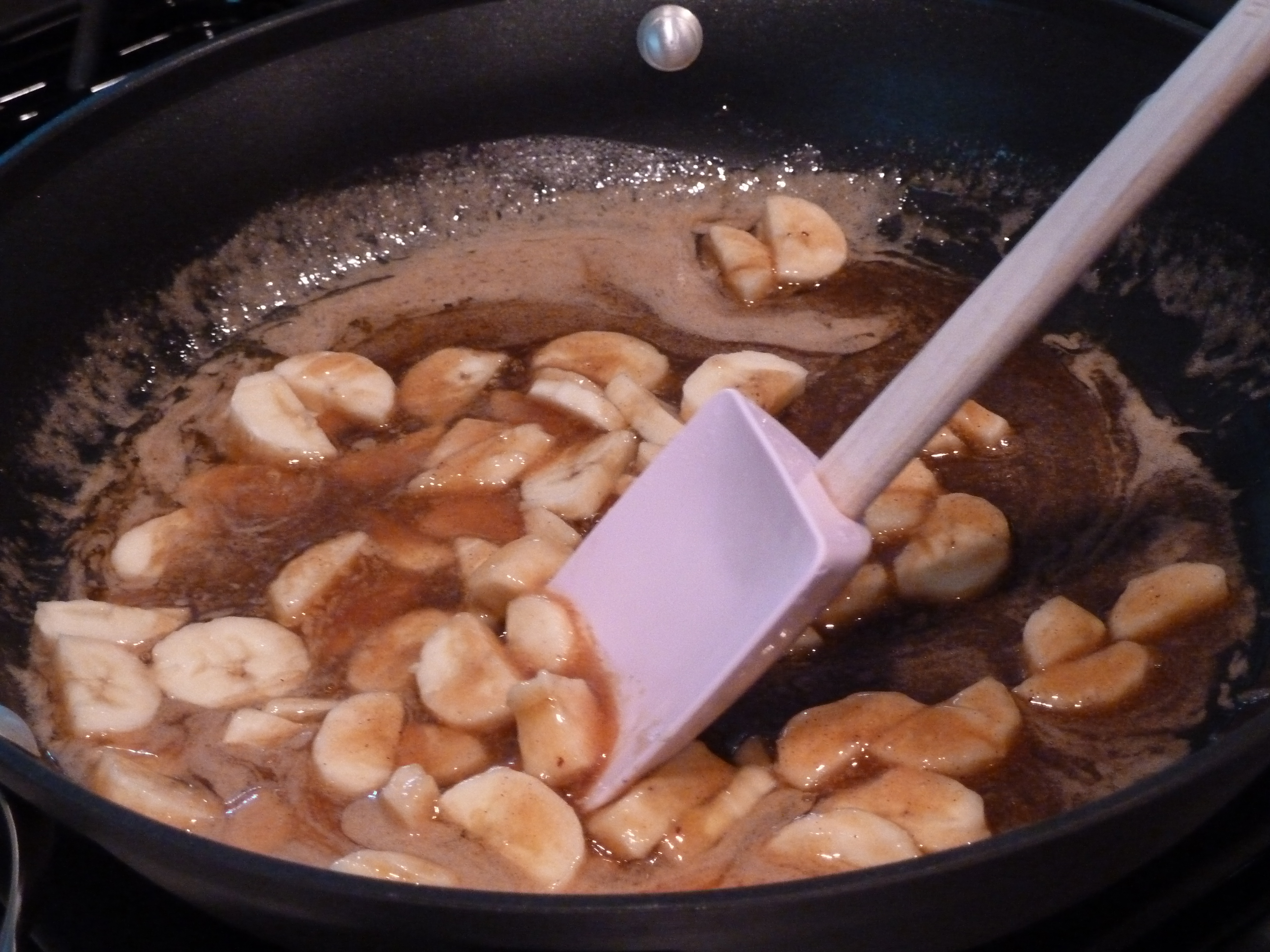 Combine the brown sugar, butter, rum, cinnamon, vanilla and bananas in a saute pan. Cook over medium heat for 4-5 minutes, until the butter-sugar mixture starts to thicken. Remove 1/2 c of the banana mixture and set aside.