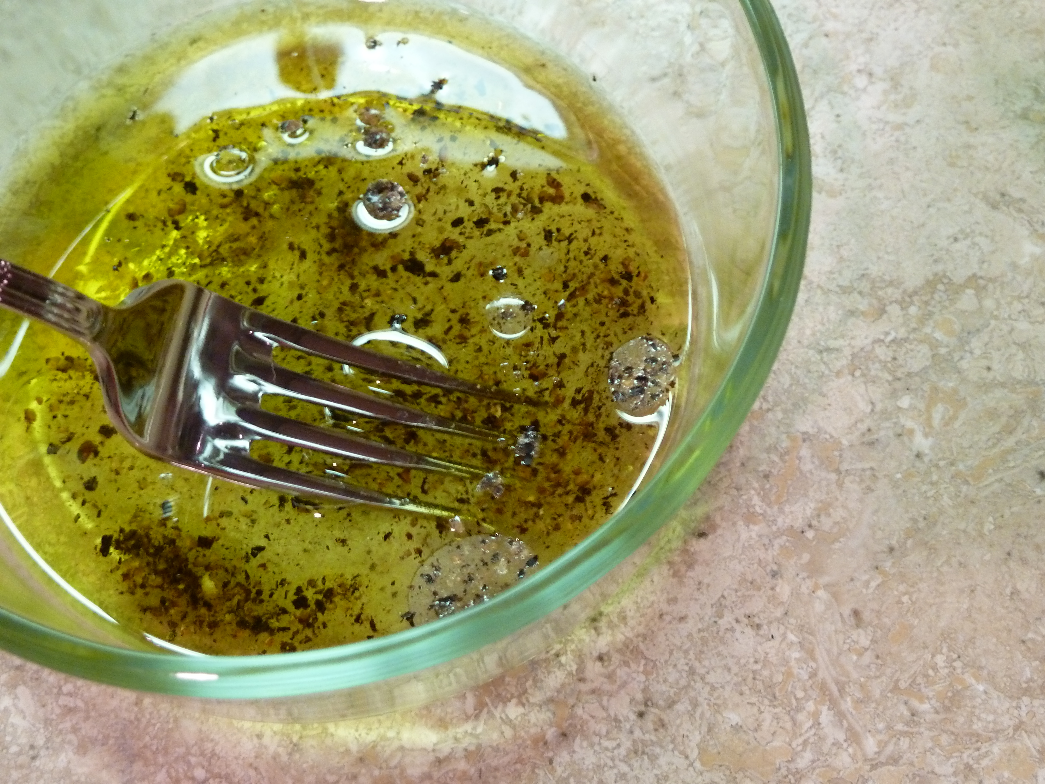In a small bowl, whisk the olive oil, vinegar, pepper and salt until well-combined.