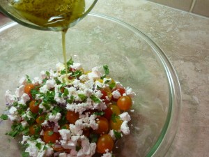 Break the feta off into small cubes but try not to crumble it too much. Add the feta to the bowl with the tomatoes, chopped red onions and chopped herbs. Drizzle the dressing over the feta-tomato mixture and toss to combine.