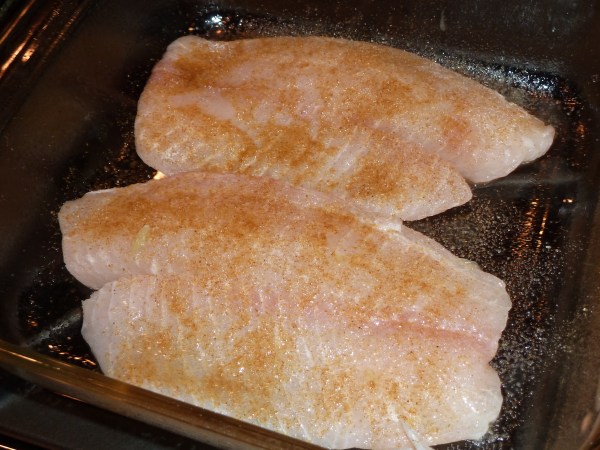 Start by placing the tilapia filets in a glass baking dish (8″ x 8″) and sprinkle cumin and garlic salt on them. Squeeze the lime over the seasoned fish.