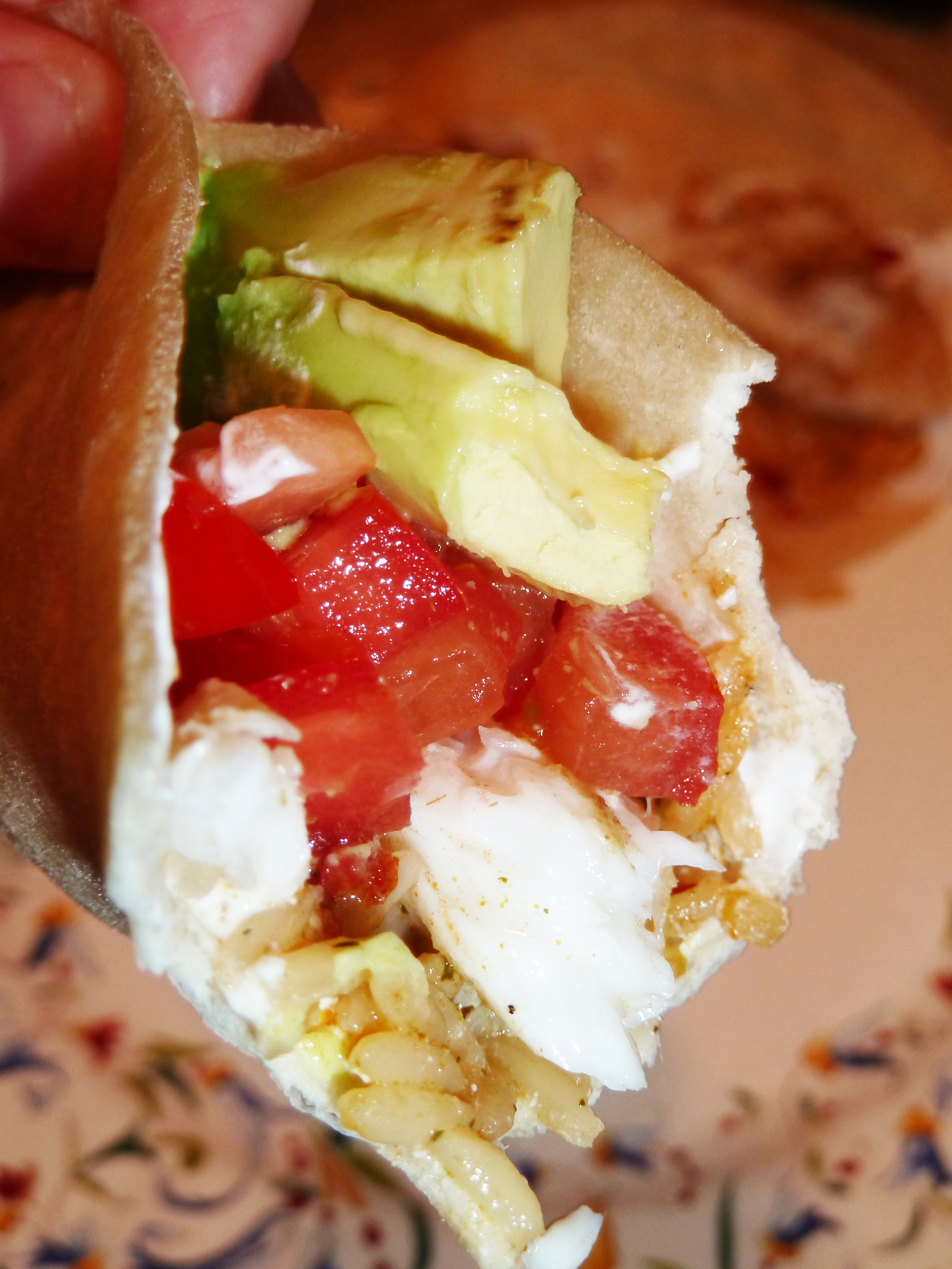 When the fish and rice have finished cooking, assemble the tacos. Our favorite condiments are sour cream, avocados and fresh salsa. We also add the rice to the tacos instead of eating it on the side.