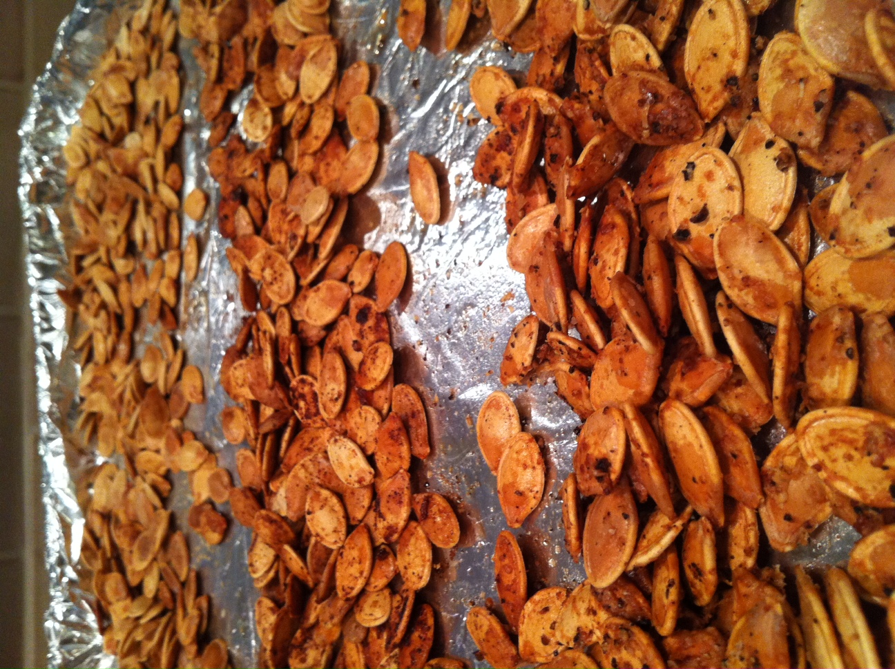 Lay the coated seeds on a cookie sheet and roast at 300 degrees F for 25-30 minutes, stirring them around the pan with a spatula every 10 minutes or so.