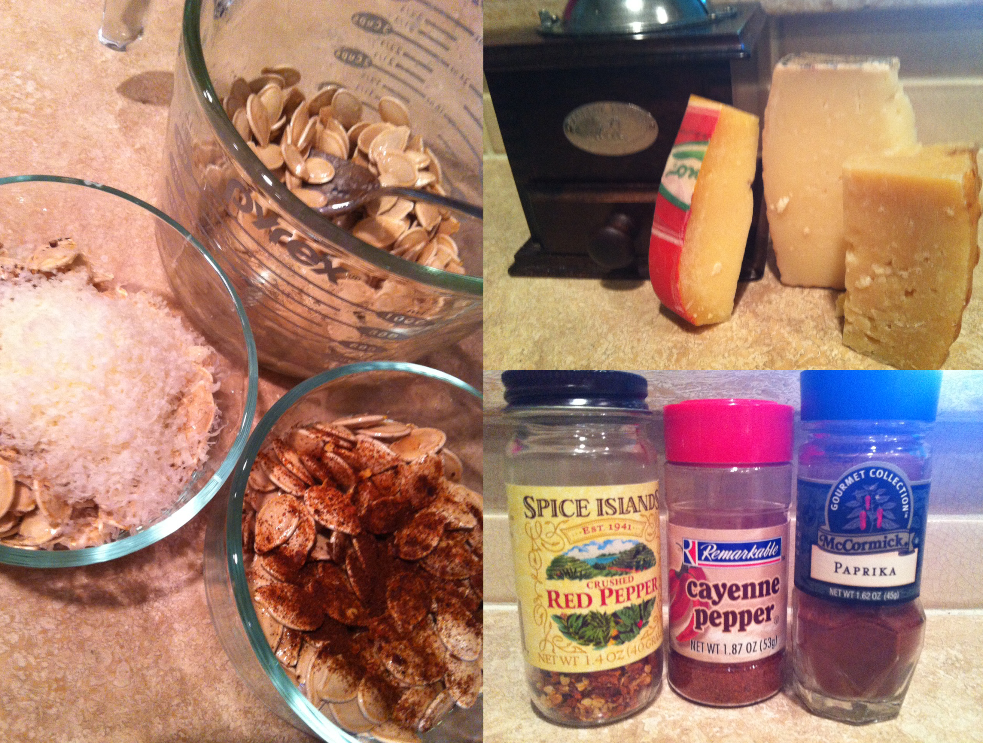 Divide the seeds into three 1-c portions.  Leave one cup as is.  Mix the paprika, red pepper flakes and cayenne with another cup of the seeds.  In the last cup, mix the black pepper and cheese.