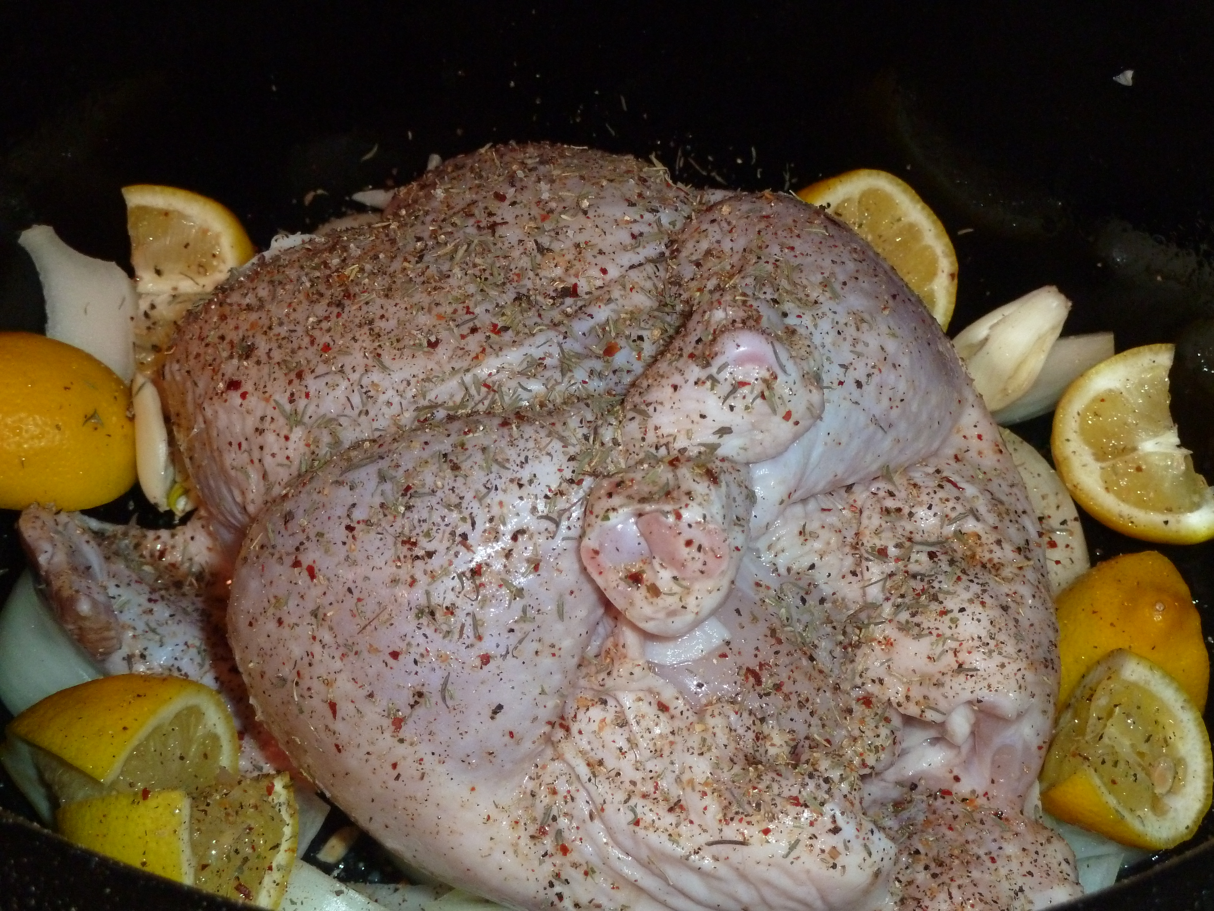 Cut an onion into large chunks and scatter them on the bottom of the crock pot. Salt and pepper the chicken and add any other spices you would like all over the outside of the chicken. I used salt, pepper, thyme, rosemary and red pepper flakes. You could do anything you want here — cumin and chili powder with limes for a Mexican chicken, herbs de provence and dried lavender for a country French taste, or make Greek chicken with a rub of yogurt, garlic, oregano and Cavender’s Greek seasoning.