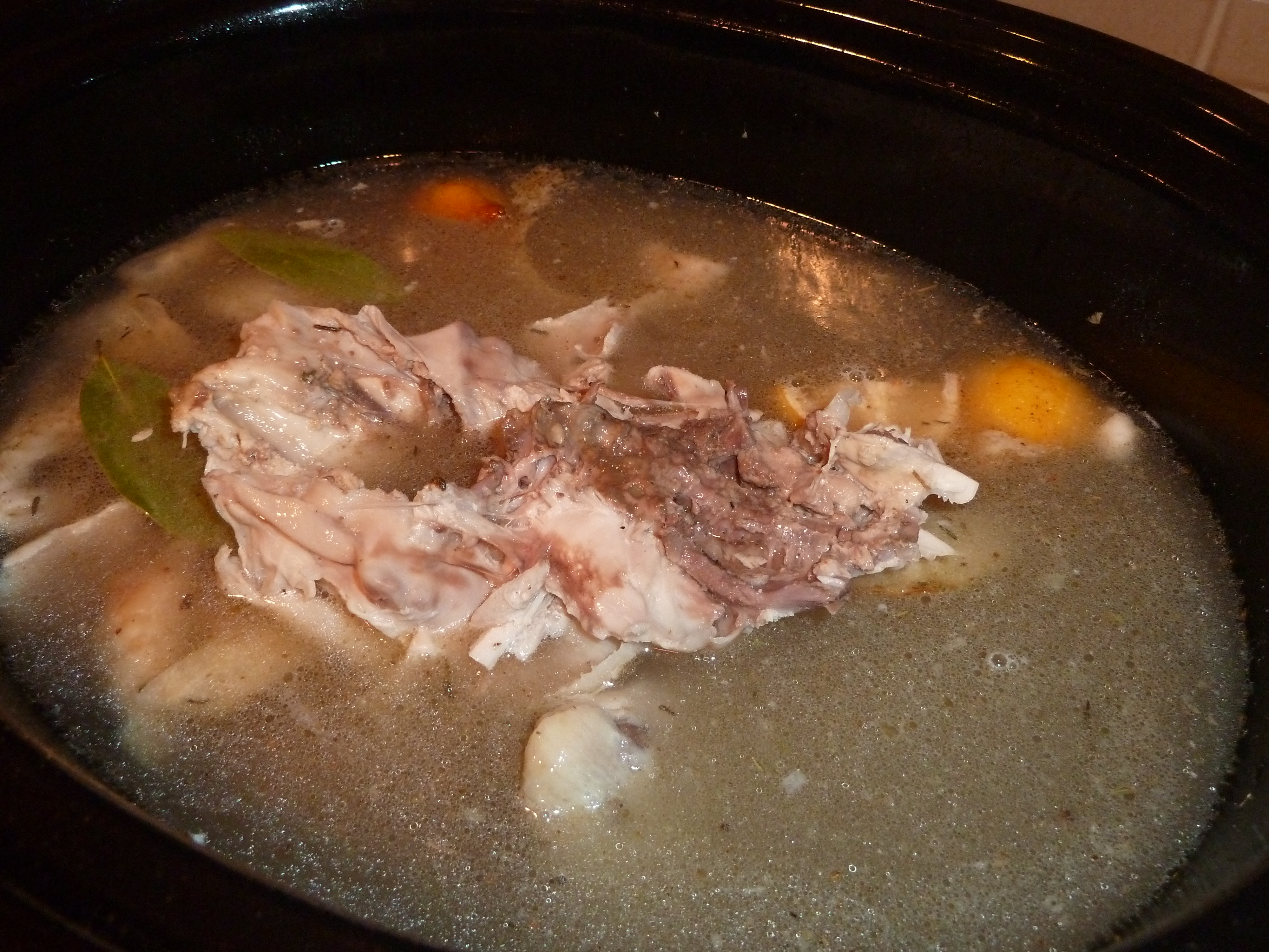 After you have removed all of the meat from the chicken, put the carcass back into the crock pot with the lemons, onions and remaining juices. Add bay leaves, celery, carrots — whatever you have on hand. Fill the crock pot with water and set it to cook on low for another 8-10 hours.