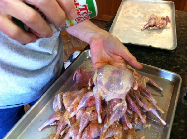 On to the recipe.  Season the quail with the Tony Chachere’s. This isn’t super clear in the picture below (thank you iPhone camera) but you don’t want to completely coat the quail.  Just a little sprinkling on each side.  Set aside.