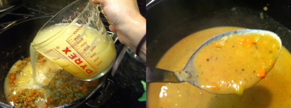 Gradually stir in the broth and continue stirring until the mixture is smooth. Add the wine and simmer, whisking, over low heat for 5 minutes.