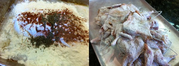 Combine ¾ cup of the flour with the paprika, nutmeg, black pepper and thyme in a shallow dish.  I like thyme so I went a little heavy on it here.  Same with the black pepper.  You can adjust these spices to you liking.  But don’t leave out the nutmeg just because it sounds like a funny addition.  It adds a nice warm undertone.