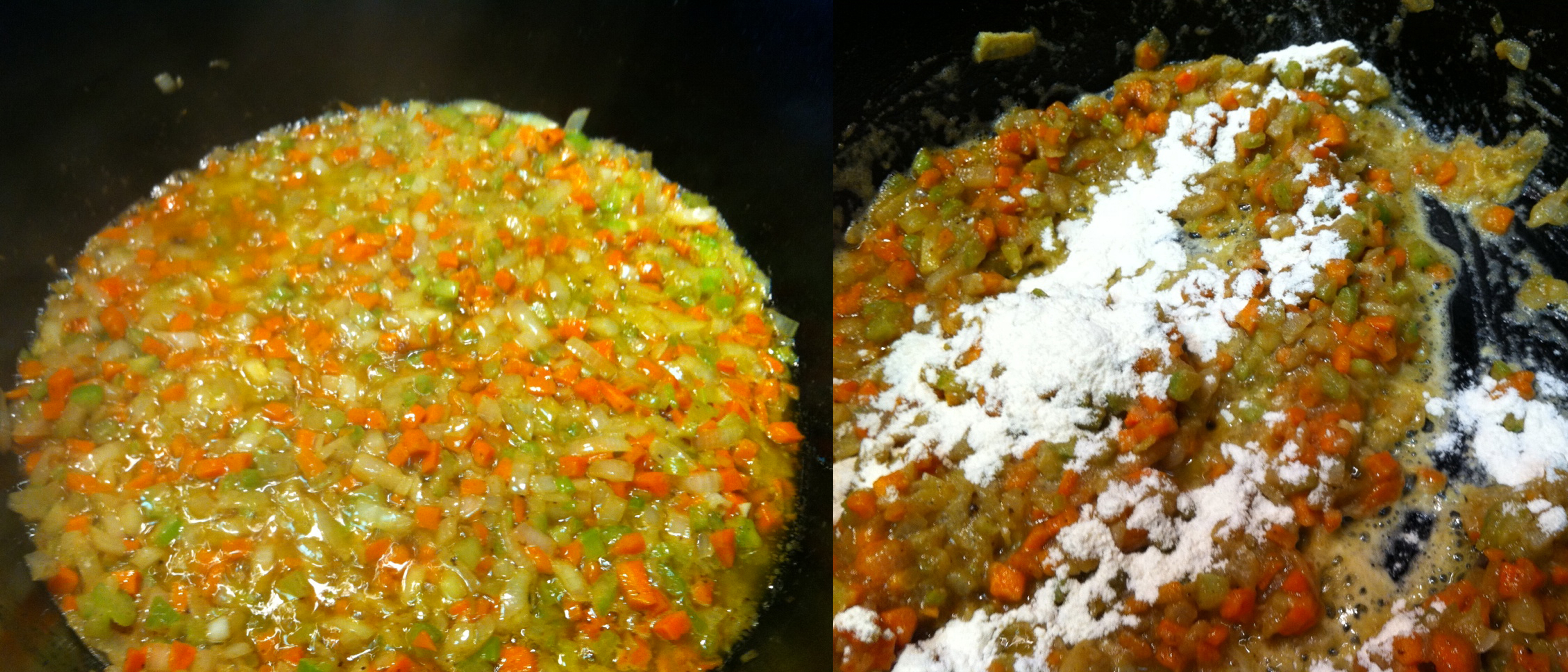 Add the remaining 8 tablespoons butter (1 stick) to the pan drippings in the dutch oven.  Add the onion, celery and carrots and cook, stirring, until they are soft, about 5 minutes. Sprinkle the remaining 6 tablespoons flour over the mixture and stir until the mixture has browned, about 15 minutes.
