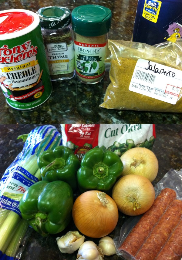 Here is what you’ll need to make smoked turkey and sausage gumbo. Top pic — seasonings. Bottom pic — everything else. Wait, where’s the turkey? Momma had already cut the meat off and boiled the carcass before I got to Baton Rouge so it was in the fridge and I forgot to take a picture.