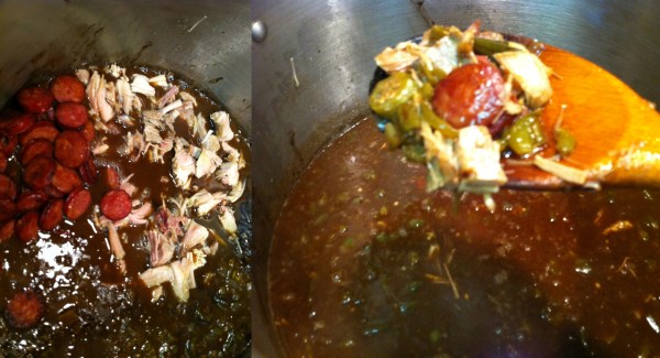 After the gumbo has simmered for 30-45 minutes with the seasonings, add the cubed turkey and continue to simmer for about 30 minutes longer, and then add the sausage and turkey which came off of the bones when making the stock. Simmer for 30 more minutes and adjust seasoning to taste.