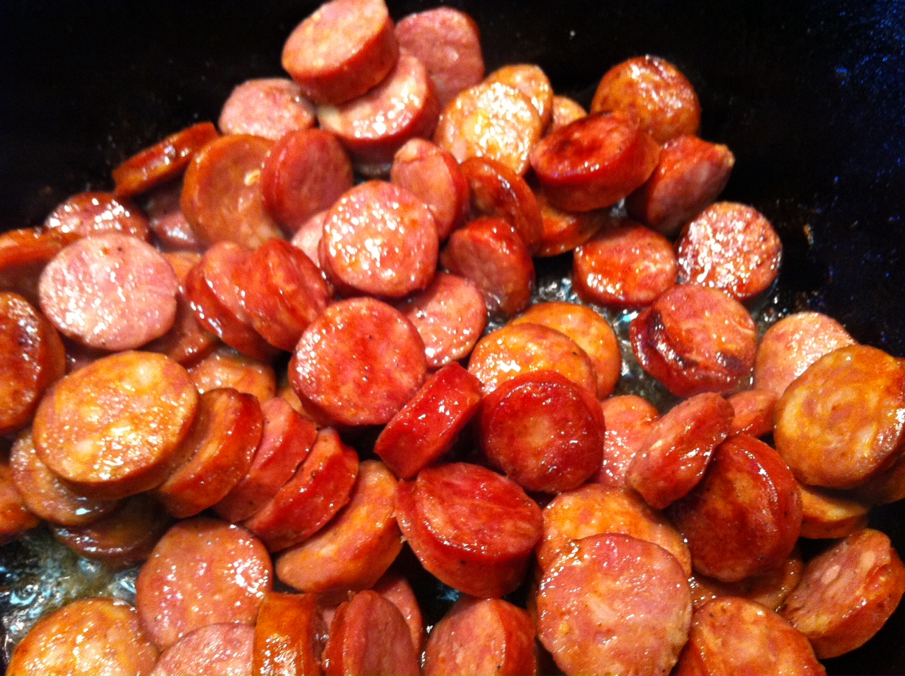 Slice the sausage in half lengthwise, then slice into ½-inch slices. Saute in a skilled until browned.