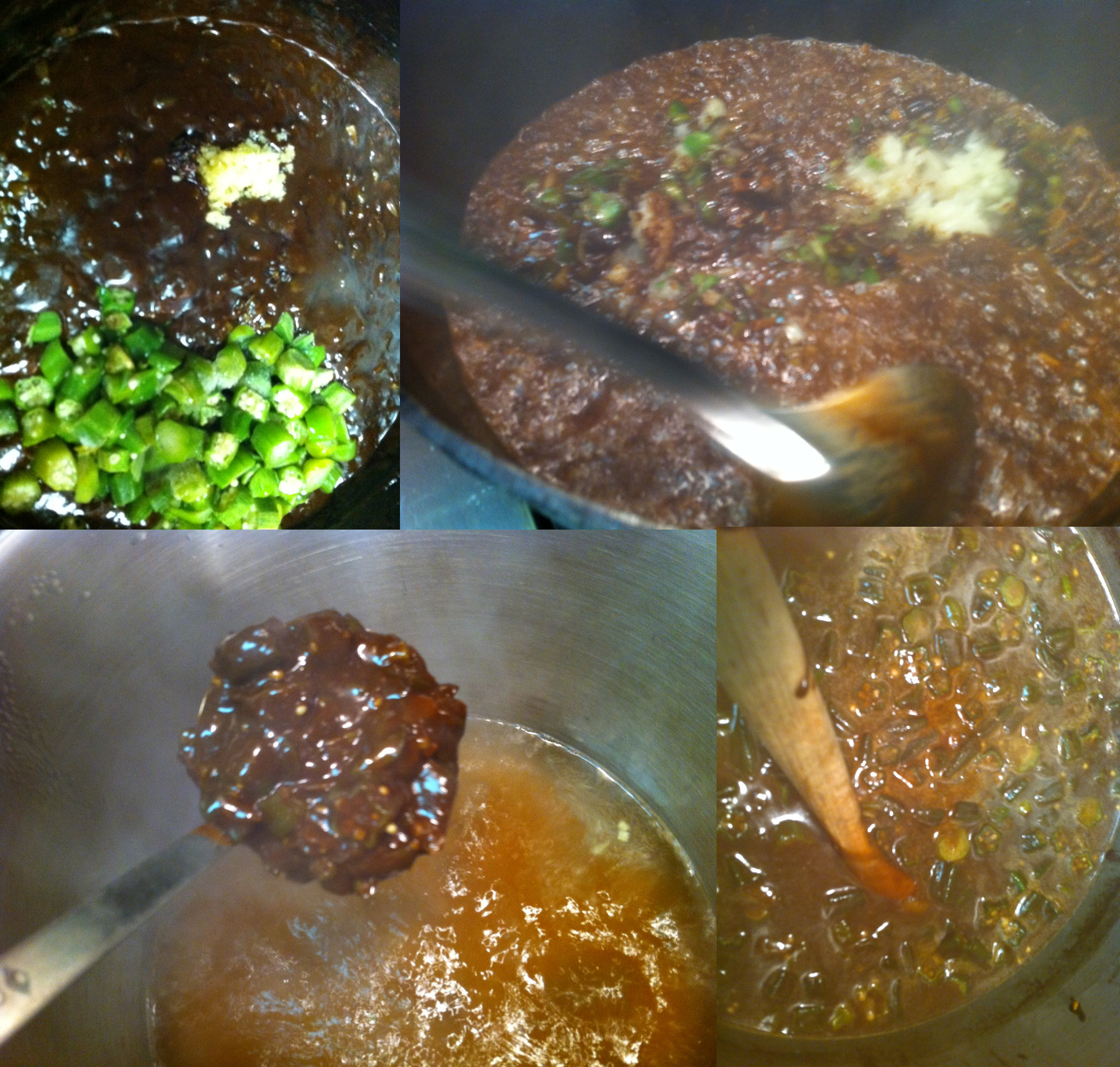 Just as the roux turns the right color, add the onions, celery and bell peppers to the roux to stop it from cooking and cook the vegetables until wilted. Add the garlic and cut okra. Sweat until the okra is softened. Bring about 7 quarts of stock to a boil in a large stock pot and then begin to add roux/vegetable mix to the stock stirring to dissolve as it is added.