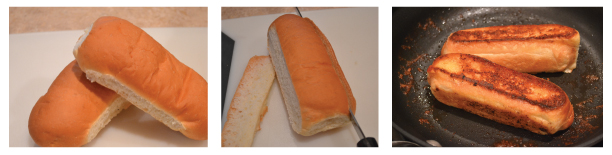 Slice a thin piece of bread off of each side of the roll so the edges aren’t crusty.  Then make a slice down the middle (length-wise) but not all the way through.  Heat a large frying pan over medium heat until hot, about 3 minutes. Place 2 tbsp. of butter in the pan.  As soon as the butter is melted, lay the buns in the pan and toast until golden brown, about one minute. Flip and toast the second side until golden brown, another minute.