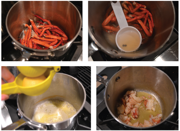 Put the reserved legs in a saucepan with 1 cup water, 6-8 peppercorns and  a bay leaf.  Bring the mixture to a boil and let cook for 10 minutes.  Remove about 2 tbsp. of the lobster stock.  Combine it with the juice of 1/2 lemon and 4 tbsp. butter over medium heat.  Once the butter is melted, add the lobster meat and stir.  Cook for just 1 or 2 more minutes until the lobster is heated through.