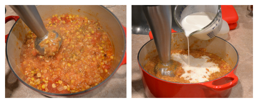 Using an immersion blender, blend the soup while slowly pouring in the cream.