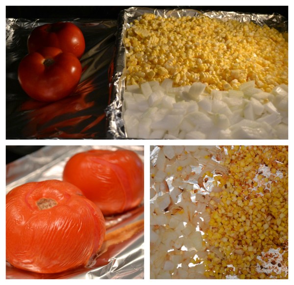 Place the tomatoes on a cookie sheet and cook at 375 degrees F for 25 minutes, until their skin starts blistering. Roast the corn kernels and onions for about 35-40 minutes, stirring throughout cooking, until they start to char and get black spots. Roast the peppers under the broiler (turning every few minutes) until they are blistered and black on all sides. Peel skins from tomatoes and peppers.
