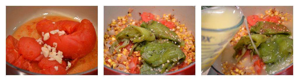 Remove the skins and the cores from the tomatoes. Add them (with their juice) to a dutch oven, along with the minced garlic, corn, onions, hatch chiles, and chicken or vegetable broth. Bring the mixture to a boil, then lower the heat and simmer for 15-20 minutes. Stir in the salt and chipotle seasoning.