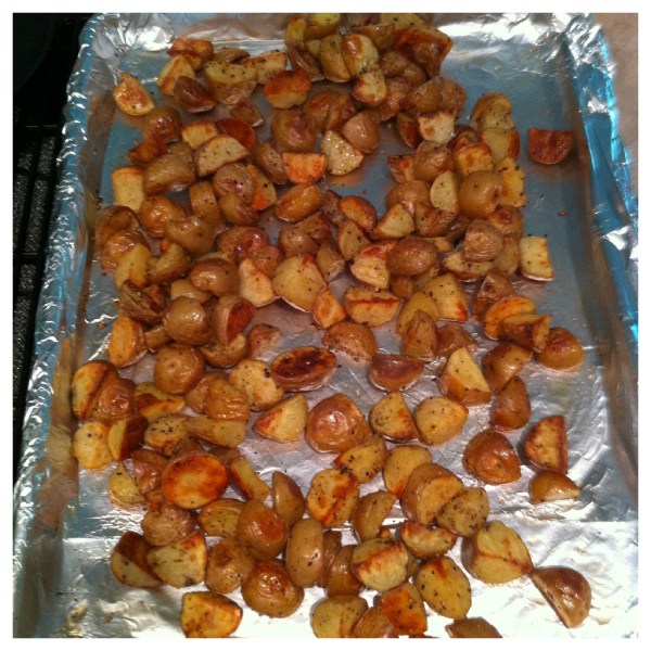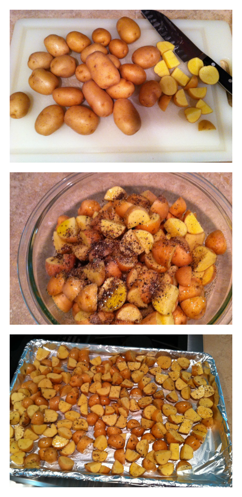 Cut the potatoes into 1/2″ cubes. Toss them with olive oil, salt and pepper. Spread the potatoes on a foil-lined baking pan and roast for 45 minutes in a 400 degree F oven.