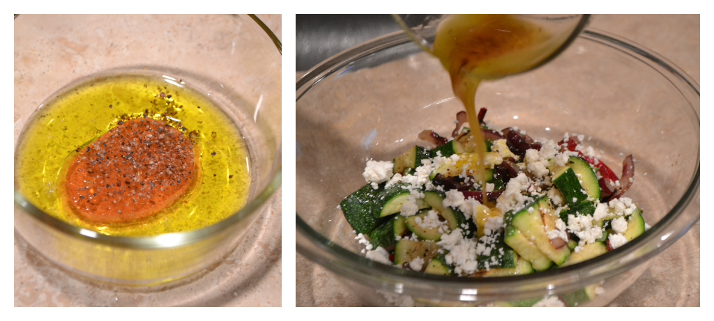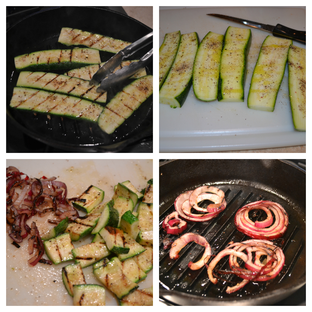 So to make this awesome salad, heat a cast iron skillet over medium-high heat. Coat the zucchini slices in salt, pepper, and olive oil. Grill the zucchini on each side for 3-4 minutes, until slightly softened and browned. Remove the zucchini to a cutting board and cut the slices into 1/2″ wide pieces.