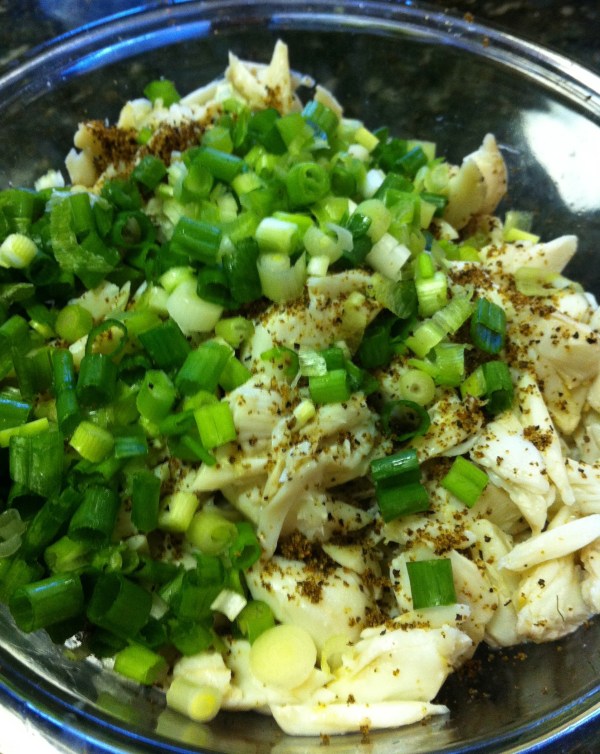 In a medium bowl, combine the cleaned crabmeat, lemon pepper seasoning, and diced green onions.  Fold carefully so that you don’t break up the lump crabmeat.